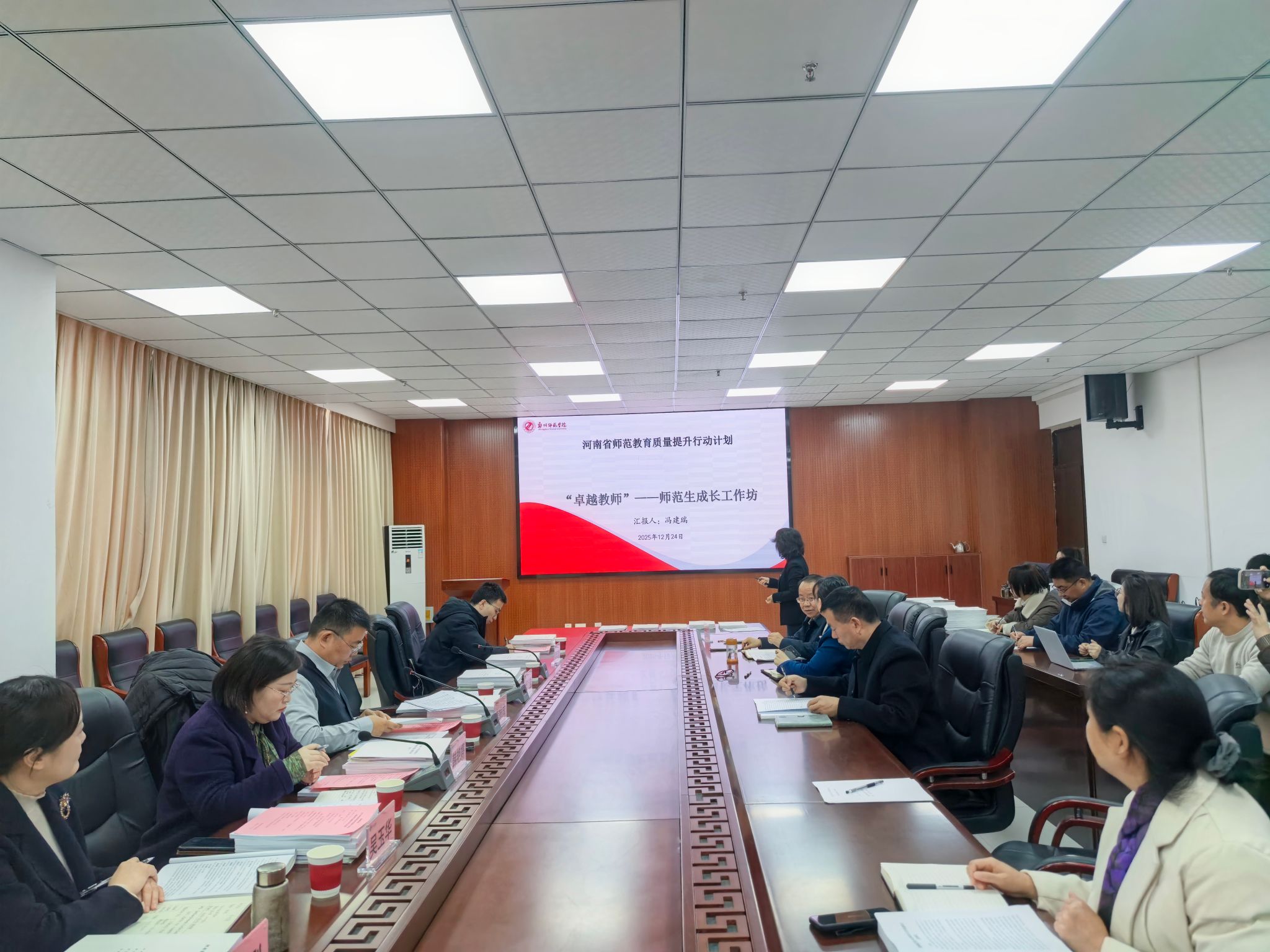 2025年12月24日上午,我校2025年度河南省师范教育质量提升行动计划示范性项目实地验收工作在尚志楼七楼708会议室顺利举行。河南师范大学教师教育学院崔振成院长、信阳师范大学教务处韩艳婷副处长、河南省基础教育课程与教学发展中心教师发展部吴玉华主任、河南师范大学教师教育学院李文超博士等四位专家组成的验收组莅临指导。教务处处长甘浩、教研科全体成员及各项目组成员参加会议。会议由教务处副处长王永刚主持。